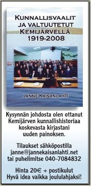 KirjojaOlen kirjoittanut useita kirjoja. Voit tilata kansanedustaja Matti Oskari Lahtelan elämäkerran Lapin Keisari minulta, puh. 040 708 4832, tai Helena Poikolaiselta, puh. 041 7078 042. Kirjan hinta on 20 euroa. Kaikki tuotto menee M. O. Lahtelan muistomerkkihankkeen hyväksi. ![]() Samoin voit tilata minun ja YTK Katri Kulmunin kirjoittaman kirjan Kokemuksia Keskustasta minulta. Kirjassa kerromme kahden nuoren ihmisten näkökulmasta ajatuksistamme poliittisesta toiminnasta. Hengellisistä kokemuksistani kertova Kokemuksiani ristin tieltä löytyy netistä - http://www.jannekaisanlahti.net/kokemuksia.pdf Kirjaa on jonkin verran jäljellä myös painettuna. Tästä kirjasta en ole perinyt mitään, ja lähetän sitä postikuluja vastaan. Kirjani Kunnallisvaalit ja valtuutetut Kemijärvellä 1919-2008 on loppuunmyyty. ![]() |