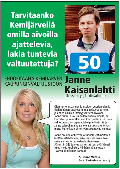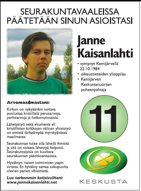 Olen ollut Kemijärven kunnallisvaaleissa 2000 ja 2004 äitini Tarja Kaisanlahden tukiryhmässä,